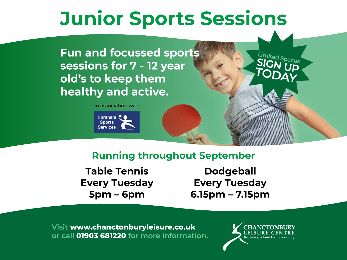 Keep your youngsters active this September with our Junior Sports Sessions in partnership with Horsham Sports Services. The fun and focussed sports sessions which include Table Tennis and Dodgeball are aimed at 7-12 year old's to keep them healthy. Available…